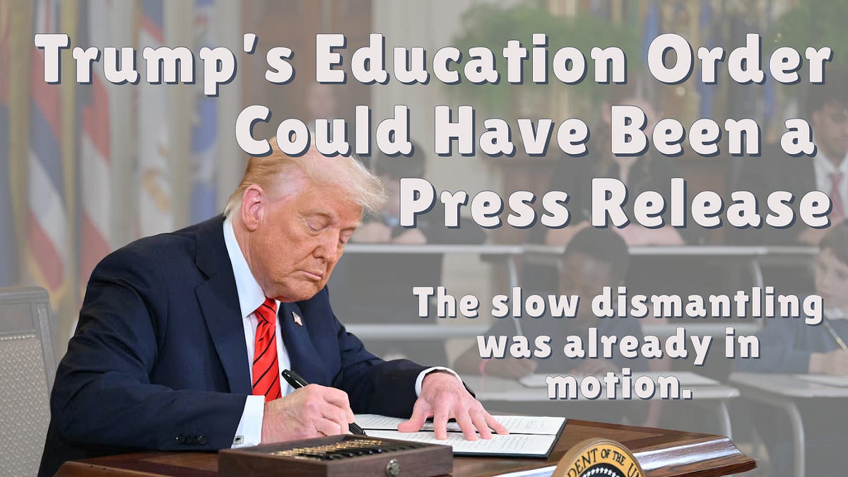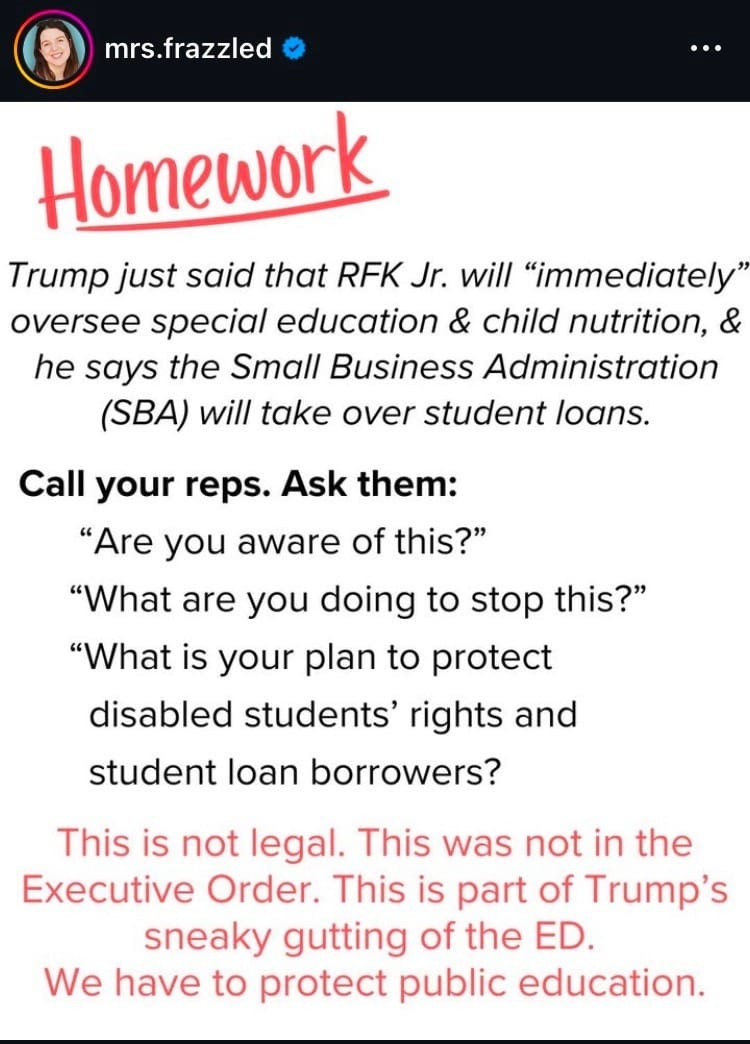 This is all to ‘give it back to the states’, which we’ve heard before, and who are the same entities that caused the creation of the department in the first place. Anyway, here’s a great explainer of the Executive Order by Mrs. Frazzled