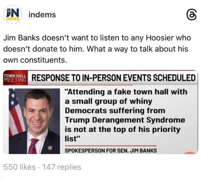 Sens. Todd Young and Jim Banks also decided not to hold their own town halls to meet with voters, which led to an ‘empty-chair’ town hall hosted by Indivisible Northeast Indiana on Friday in Ft. Wayne.