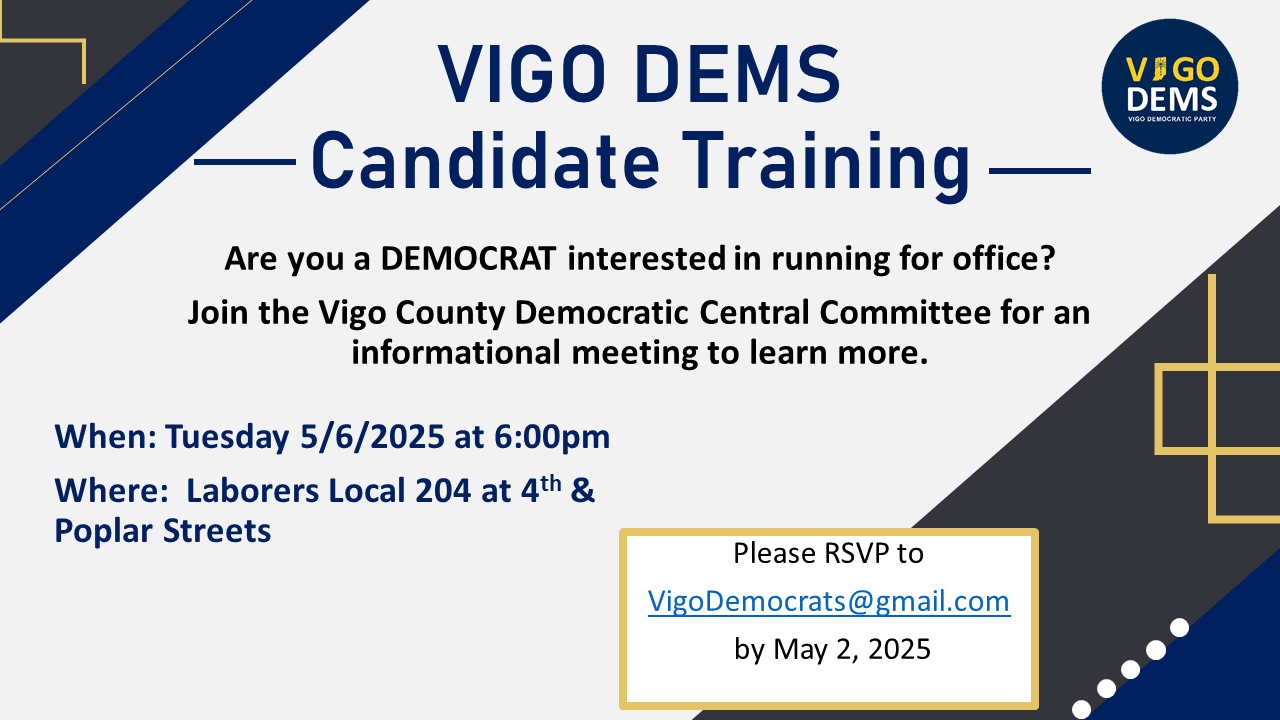 Interested in running for office? The Vigo Dems will be hosting a candidate training session May 6, 2025. Please RSVP by 5/2/2025 to [email protected].