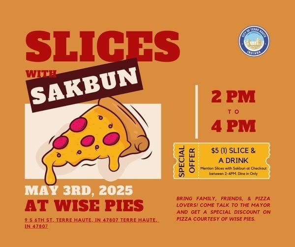 Saturday, May 3rd, 2-4pm: Slices with Sakbun at Wise Pies. Informal opportunity to chat with the mayor.