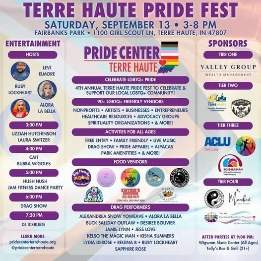 Saturday, September 13th at 3pm: Terre Haute Pride Fest at Fairbanks Park. 3-8pm. More info here
