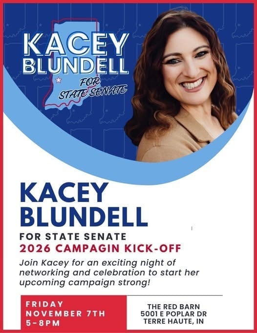 Friday, November 7th at 5pm: Kacey Blundell State Senate District 38 Campaign Kickoff. “Come enjoy an evening of community, networking, and celebration as Kacey shares her vision for a stronger future for Indiana.” 5–8 PM at The Red Barn