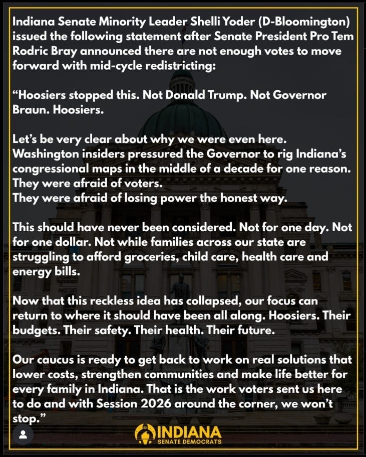 Of course, Trump is bag mad about this. In a social media post, Trump said he was “very disappointed” in Indiana Senate Republicans, particularly Senate President Pro Tempore Rod Bray and Terre Haute Sen. Greg Goode. Trump framed the opposition as a failure of party loyalty, criticizing Bray and Goode as “two politically correct type ‘gentlemen’” and suggesting they were obstructing efforts to gain additional Republican seats.