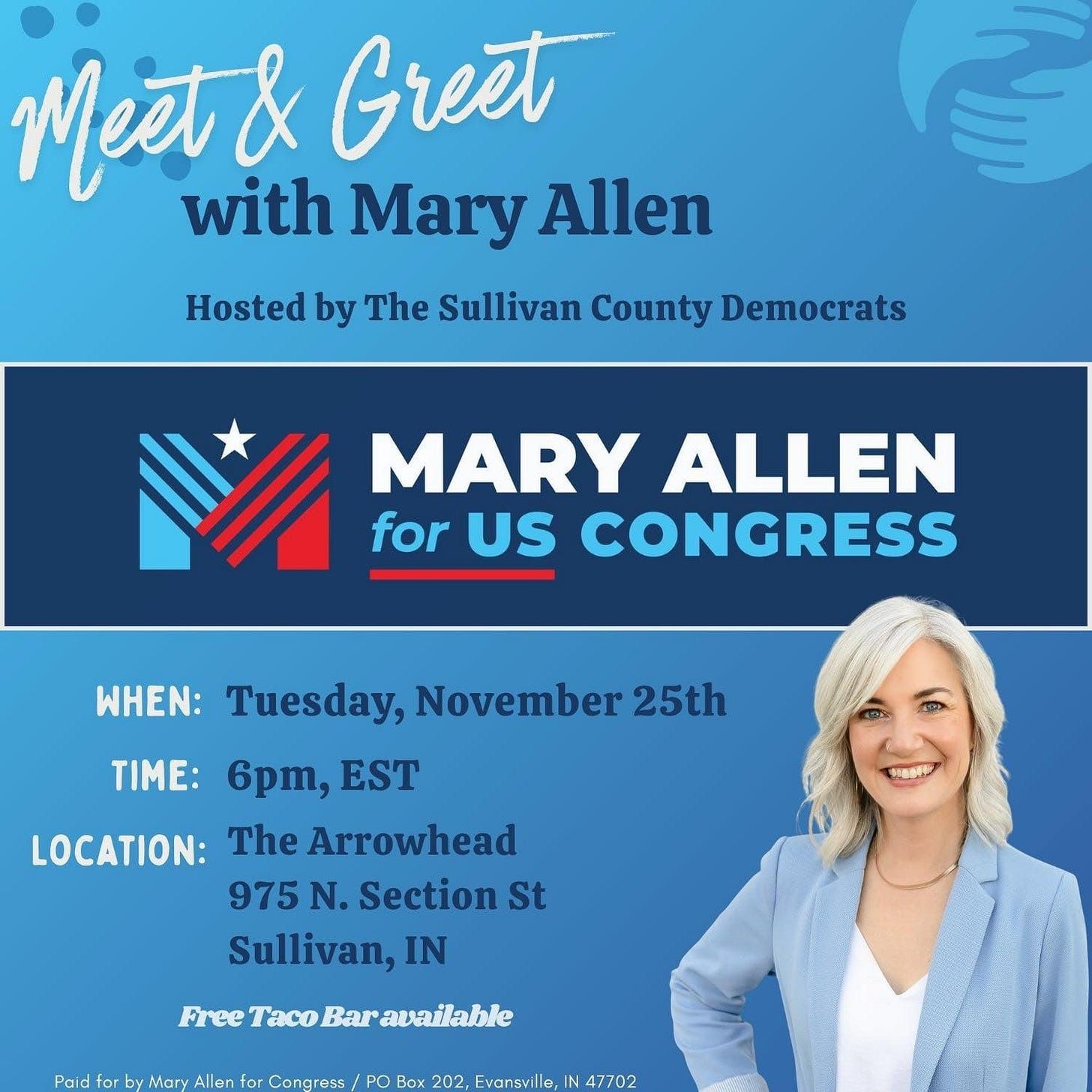 Tuesday, November 25th at 6pm: Mary Allen (8th district Congressional candidate) will be hosting a free taco bar at the Arrowhead in Sullivan