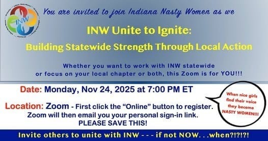 Monday, November 24th at 7pm: Indiana Nasty Women Zoom call: We are looking forward to working with many of you to re-establishing the statewide and county groups’ connections AND support. Register here.