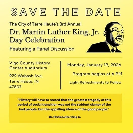 The City of Terre Haute’s annual Dr. Martin Luther King, Jr. Day Celebration & Panel Discussion, hosted by the Human Relations Commission in partnership with the Vigo County History Center and the NAACP will be Monday, Jan. 19th at 6:00 PM at the Vigo County History Center Auditorium