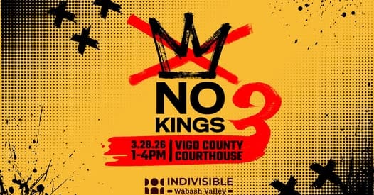 Monday, March 16th at 5pm: Sign Making for No Kings, hosted by Indivisible Wabash Valley. 5-7pm at the Vigo County Public Library, meeting rooms B & C. More information & register here.