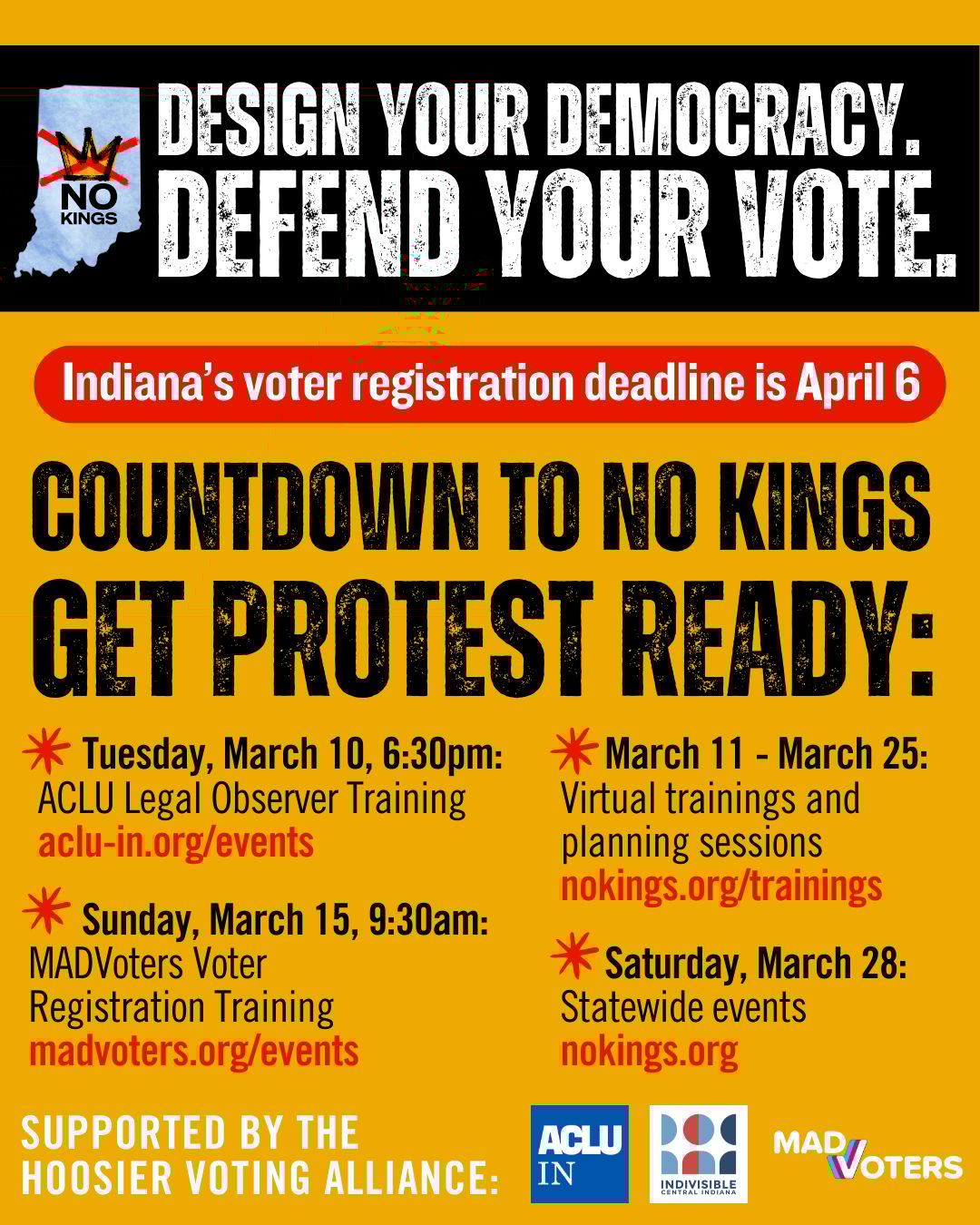Here are some upcoming opportunities from the Hoosier Voter Alliance to get protest ready AND vote ready!