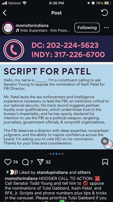 Confirmation hearings for Tulsi Gabbard, RFK Jr and Kash Patel were healed last with with votes expected early this week. Todd Young is moveble on these picks - especially on Gabbard. Call him (and Jim Banks, why not - 202-224-4814) and tell them how much you support merit, experience, and intelligence in hiring and how these clowns don’t have anything like that. Scripts from @momsforindiana