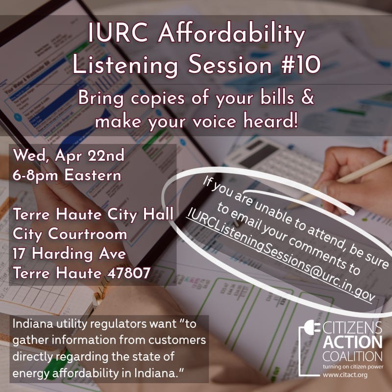 Wednesday, April 22nd at 6pm: Utility Rates Town Hall at TH City Hall. Indiana Utility Regulatory Commission Commissioner Andy Zay is on a listening tour of cities to hear people share their frustrations with rate increases. This event is free and open to the public.