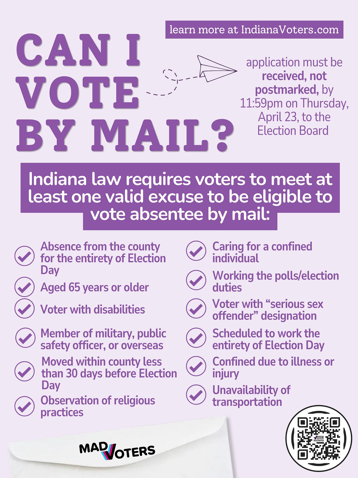 Thursday, April 23rd at 11:59pm: deadline to have your request for an absentee ballot received (not postmarked) to the local Election Board
