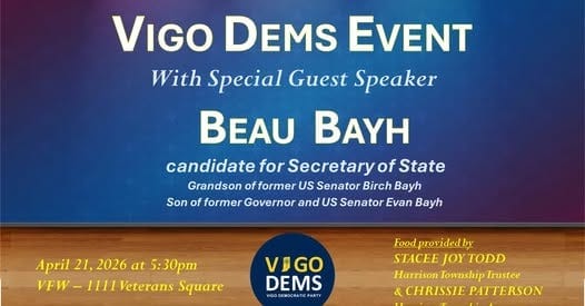 Tuesday, April 21st at 5:30pm: Vigo Dems ‘event’ featuring Beau Bayh, one of the Indiana Secretary of State candidates.