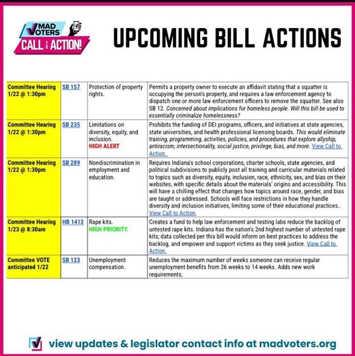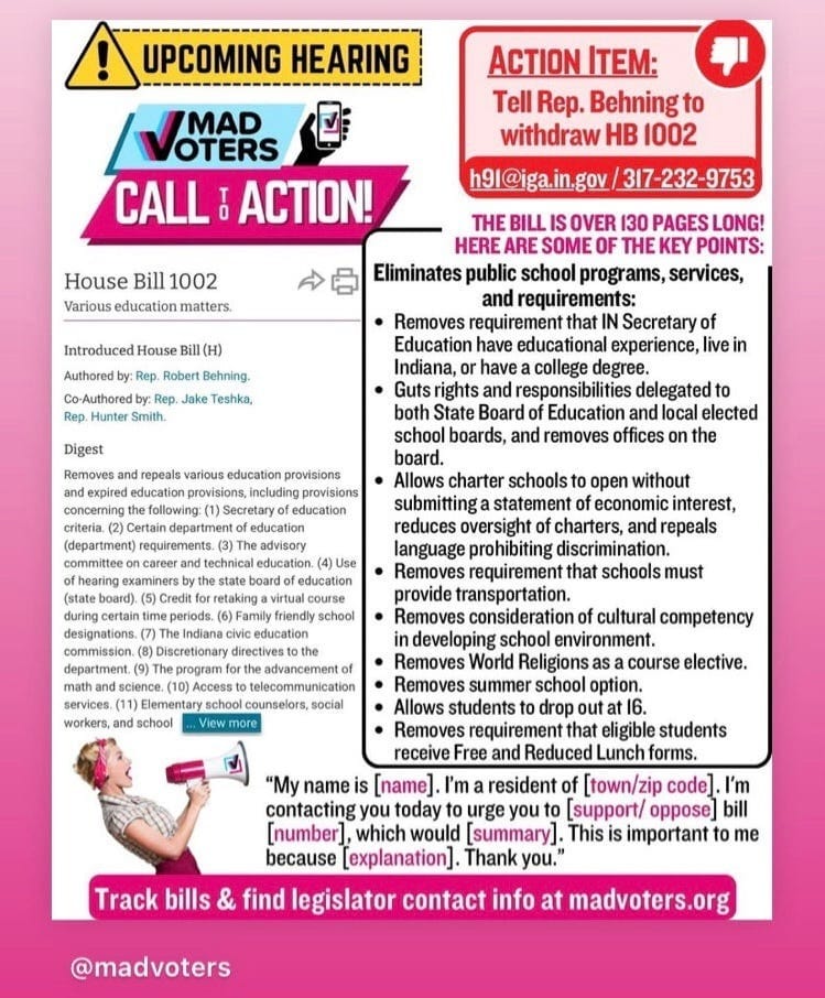 from MADVoters Indiana Facebook page re: why oppose this bill: “SB 143 is an inflammatory bill built on culture issues, and could really endanger vulnerable youth in unsafe homes. For example, last year the legislature pushed through a new law to mandate schools inform parents if their child requested a new name or pronoun at school. This is a sensitive and complex topic, and if a student feels their parents aren't a safe person to tell, it's a pretty clear indicator that the student may not be living in a safe and supportive household. Youth have a right to safety, and while we as parents and caregivers nurture and guide them, they are their own people, and not for us to domineer, control, and force into unsafe situations.”